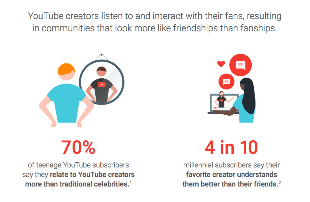 Generation Z has a similar response to YouTube stars. Seventy percent of teenage subscribers say they relate to YouTube creators more than traditional celebrities. This perception translates into real actions, too. Social media creator content performs far better than traditional celebrity content on the same channels. Views and actions on social media creator content are two and three times higher than that from celebrities. Even more impressively, social media creators get 12 times the number of comments that a traditional celebrity does.